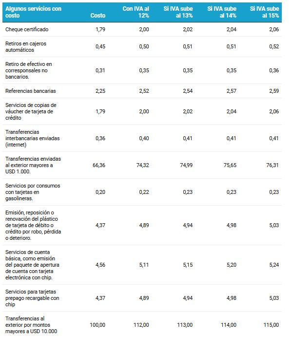 Cerca de 60 tipos de servicios financieros están gravados con Impuesto al Valor Agregado en Ecuador (IVA) en Ecuador, según la Junta de Política y Regulación Financiera. Con el alza del IVA del 12% al 13% de manera permanente, el costo de estos servicios también subirá. El veto parcial del presidente de la República, Daniel Noboa, al Proyecto de Ley para enfrentar el conflicto armado interno en Ecuador, quedó ratificado el 9 de febrero, luego de que el Pleno de la Asamblea no alcanzara los votos para pronunciarse sobre el veto. Además del aumento permanente del IVA, el Parlamento podrá facultar al presidente para incrementar el tributo hasta 15%, con base en las «condiciones de las finanzas públicas y de balanzas de pago», según el veto presidencial.
