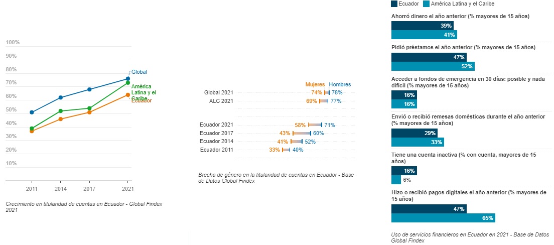 En el ámbito digital, los resultados indican que en Ecuador el 71,7 % de la población bancarizada se conecta a su banco/cooperativa a través del canal online. Existe otro 28,1 % de la población que es digital, pero no financiero. Este mismo análisis, por edad, muestra que los digitales financieros crecen a medida que la edad del usuario financiero es inferior: de 18 a 30 años (77,6 %), de 31 a 59 años (74,1 %) y de 60 años o más (50 %). El nivel de no bancarización es superior entre mujeres (20,9 %) que entre hombres (18,3 %). Es también mayor en el tramo de edad de 25 a 54 años (por encima del 24,0 %), y en Cuenca (21,7 %) y Loja (22,1 %).